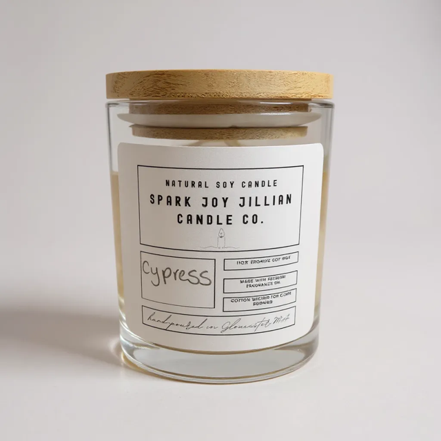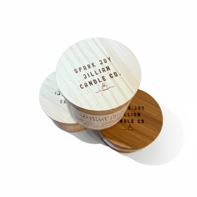 Medium Candle: 10 oz. net weight in a clear glass jar with a bamboo wood top. Cotton wicks ensure up to 20 hours of burn time.